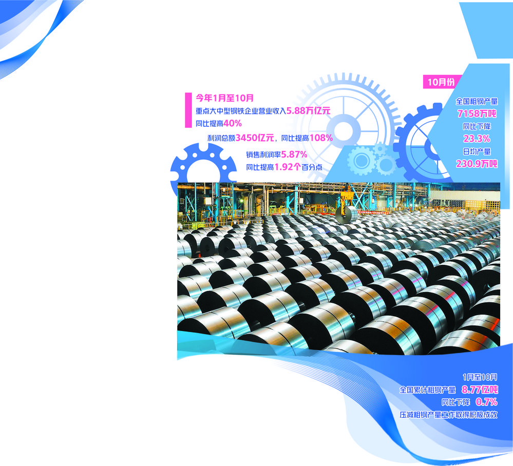 今年,钢铁行业运行呈现前高后低的走势。自7月份以来,我国粗钢产量连续4个月保持同比下降,国家统计局数据显示,10月份,全国粗钢产量7158万吨,同比下降23.3%,日均产量230.9万吨,为2018年以来的日产最低。压减粗钢产量工作取得积极成效。