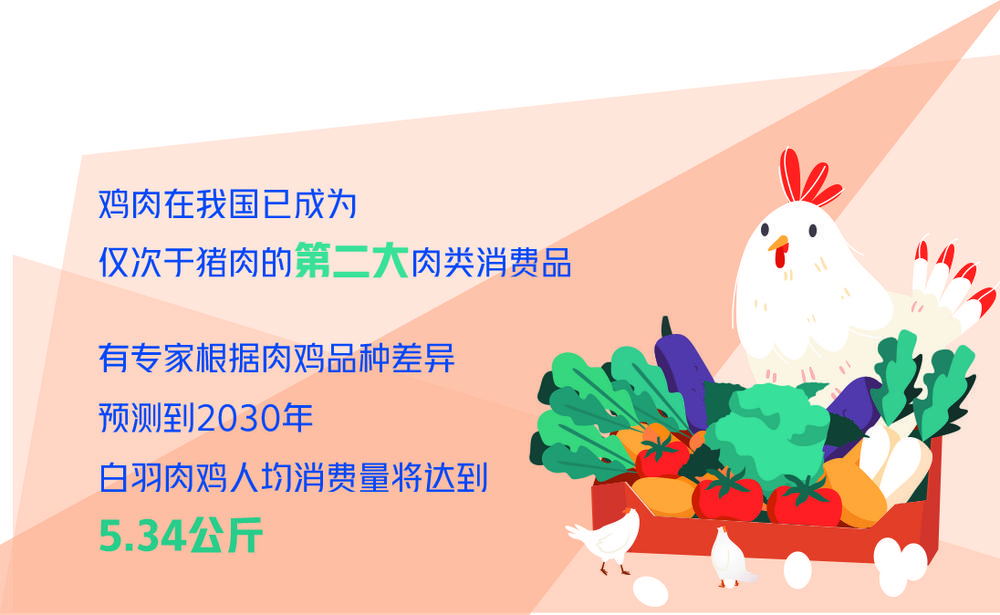 当前,鸡肉在我国已成为仅次于猪肉的第二大肉类消费品。2020年,我国鸡肉总产量达到1865.6万吨,其中白羽鸡肉占比达52.4%。白羽肉鸡年出栏50亿只,具有饲料转化率高、生长速度快、生产效率高、对环境负面影响小等显著优势,是畜牧业乃至农业中产业化、规模化、市场化程度最高的产业。