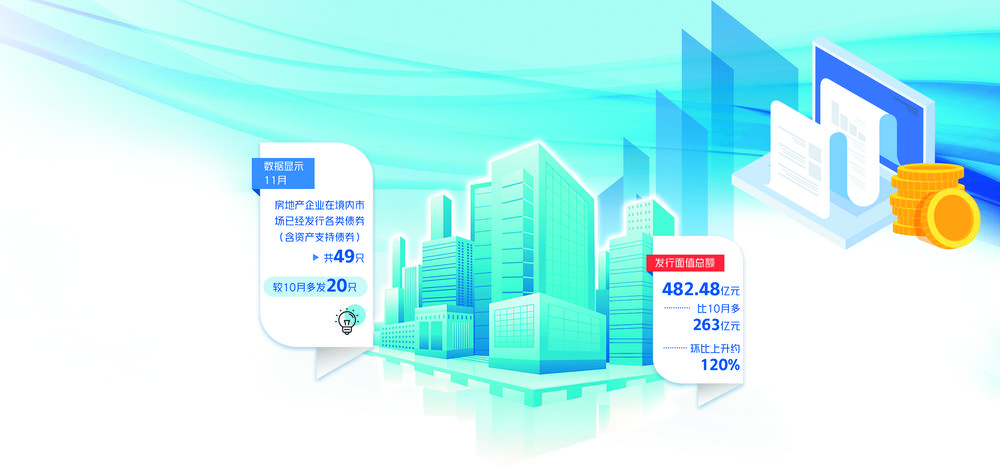 从近期债券发行的情况看,房地产企业债务融资环境正在逐步回暖。数据显示,11月,房地产企业在境内市场已经发行各类债券(含资产支持债券)共49只,较10月多发20只;发行面值总额达482.48亿元,比10月多263亿元,环比上升约120%。从债券类型看,11月发行的地产债券多为银行间市场的中期票据和超短期融资券。