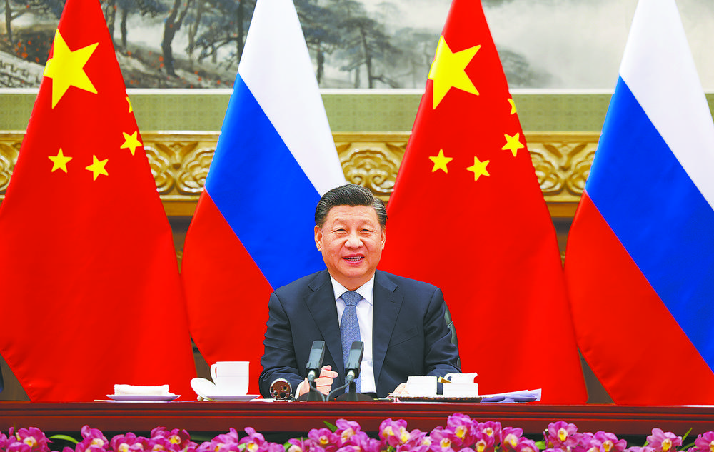 习近平强调,当前,世界百年变局和世纪疫情交织影响,世界进入动荡变革期。中俄关系经受住各种风浪考验,展示出新的生机活力。我同总统先生通过多种方式就重大议题保持沟通和协调,共同为中俄关系把舵领航。双方正式宣布《中俄睦邻友好合作条约》延期并赋予其新的时代内涵,在涉及彼此核心利益问题上坚定相互支持,捍卫了各自国家尊严和两国共同利益。