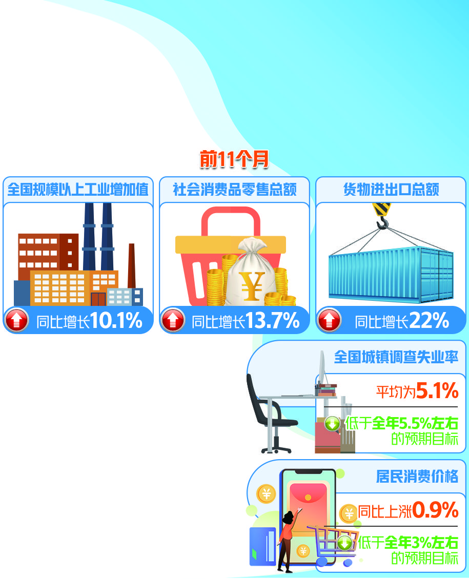 本报北京12月15日讯(记者熊丽)12月15日,在国新办举行的新闻发布会上,国家统计局新闻发言人、国民经济综合统计司司长付凌晖表示,11月份,国民经济继续恢复,实体经济稳中有升,就业物价总体稳定,进出口增势良好,民生保障有力,发展质量稳步提升。
