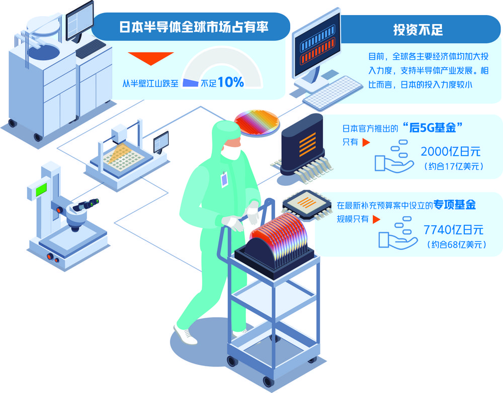 对日本政府而言,虽然出台了数字产业新战略,但相比其他经济体依然“投资不足”。日本官方推出的“后5G基金”只有2000亿日元(约合17亿美元),近期又在最新补充预算案中设立了7740亿日元(约合68亿美元)的专项基金,支持尖端半导体生产企业。欧盟投资则达1345亿欧元(约合1512亿美元)、美国为520亿美元。日本重返半导体强国之路任重道远,必须加大投入。