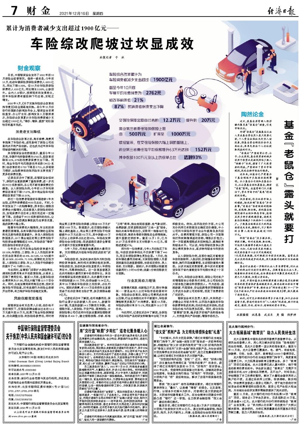 记者在采访中了解到,在银保监会组织下,保险行业重新测算了基准保费,进一步优化NCD系数规则,各公司不断完善保费定价模型。以人保财险为例,今年前10月车均保费较改革前下降17.67%,其中商业险车均保费较改革前下降22.21%。