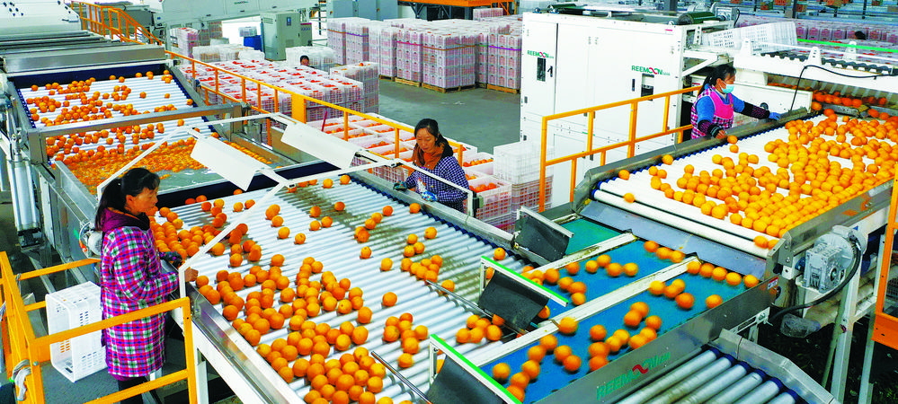 12月16日,四川省眉山市青神县冷链物流产业园区内,员工在柑橘自动化专业生产分拣车间的清洗线上忙碌。近年来,青神县通过建冷链物流产业园区和加工生产线,确保全县18万亩晚熟柑橘增产增收。姚永亮摄(中经视觉)
