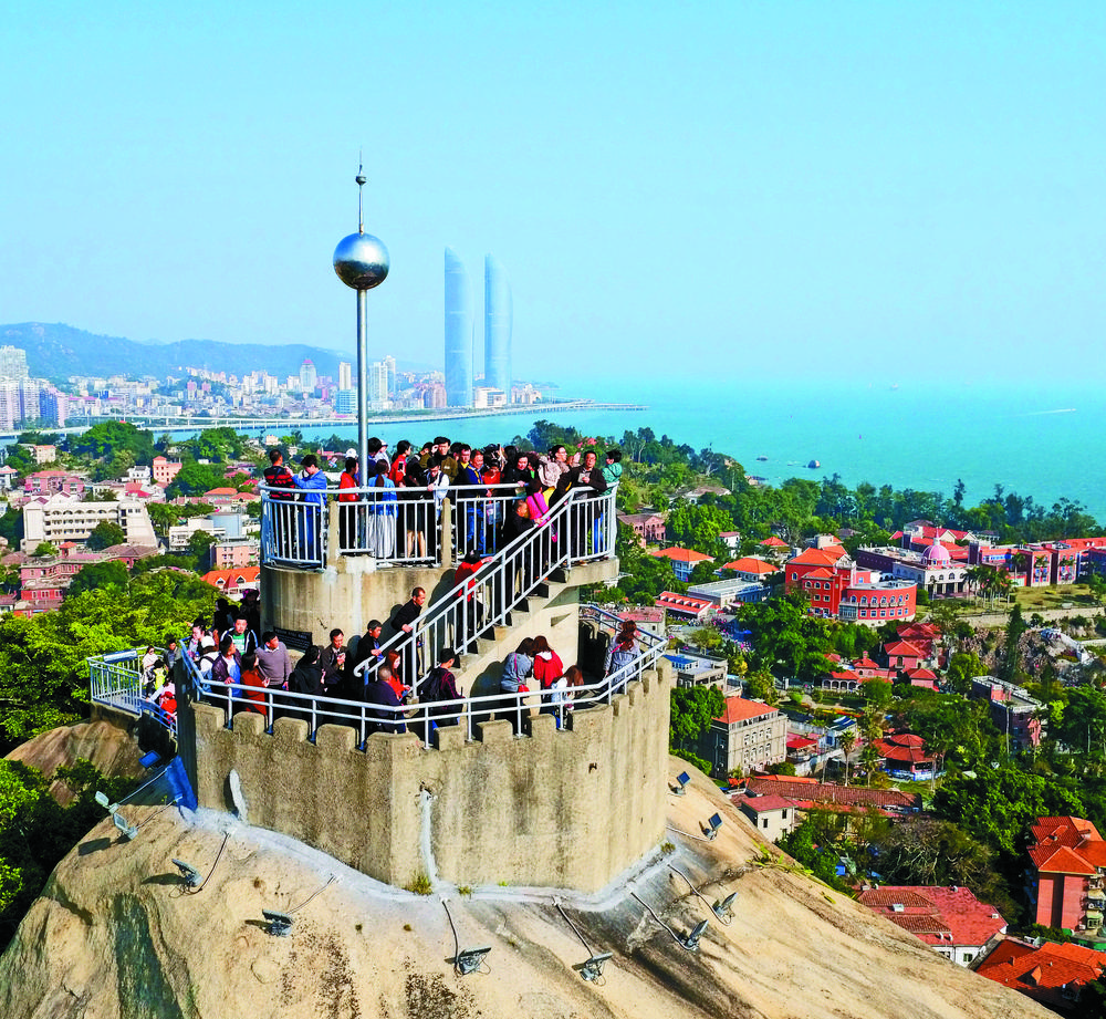 ▶游客在厦门市鼓浪屿日光岩上游览。鼓浪屿被誉为“万国建筑博览馆”“音乐之岛”“钢琴之岛”。厦门市科学规划,从城市格局、历史建筑、景观环境等不同层面开展遗产保护,让鼓浪屿世界文化遗产活起来、传下去。王火炎摄(中经视觉)