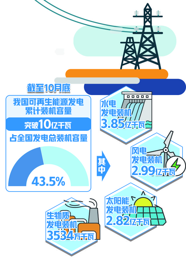 今年以来,面对快速增长的能源需求,我国主要新能源品种产量持续增长,供应能力进一步增强。据行业统计,截至今年10月底,我国可再生能源发电累计装机容量突破10亿千瓦,占全国发电总装机容量的比重达43.5%。