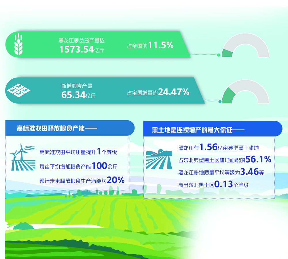 土地生产潜能是粮食稳产、增产的根本。“黑龙江作为东北黑土区核心区域,有1.56亿亩的典型黑土耕地,占东北典型黑土区耕地面积的56.1%,这也是实现连续增产的最大保证。”黑龙江省黑土保护利用研究院院长刘杰说。