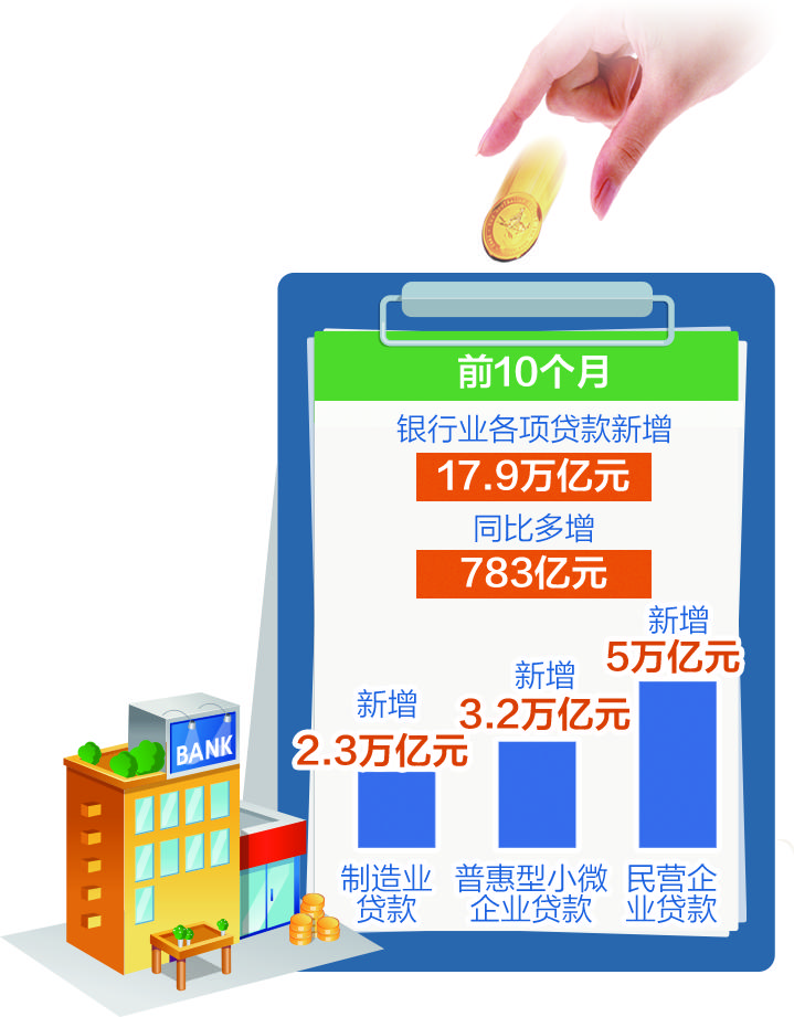 今年以来,银行业持续推动供给侧结构性改革,在为实体经济提供充足“血液”的同时,推动信贷结构持续优化。前10个月,银行业各项贷款新增17.9万亿元,同比多增783亿元,资金供给合理充裕,有效满足了实体经济合理资金需求。