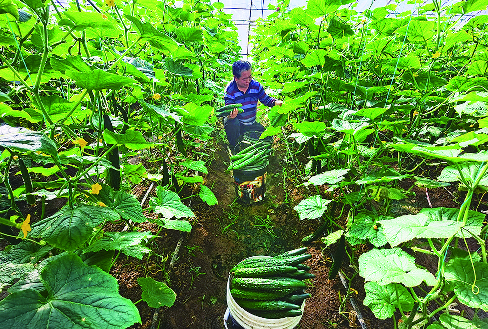 近日,在山东省聊城市东昌府区道口铺街道办事处新建的果蔬大棚里,农民在采摘黄瓜。近年来,当地整合乡村振兴补助资金,吸引多种资金参与,开发建设农业基地,建立起集育苗、蔬菜种植于一体的“致富大棚”。农民在领取“分红”的同时又可以在农业基地挣工资,实现家门口就业。 苗广杰摄(中经视觉)
