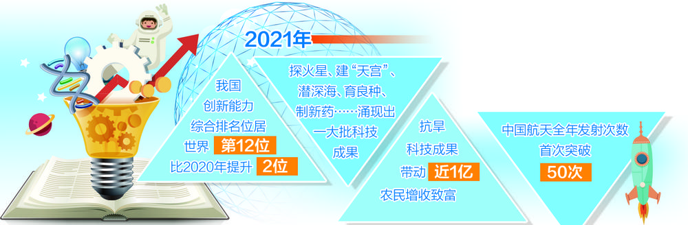 2021年,我国科技事业取得累累硕果。探火星、建“天宫”、潜深海、育良种、制新药……这一年涌现出的一大批科技成果,在世界舞台上留下了浓墨重彩的中国印记。