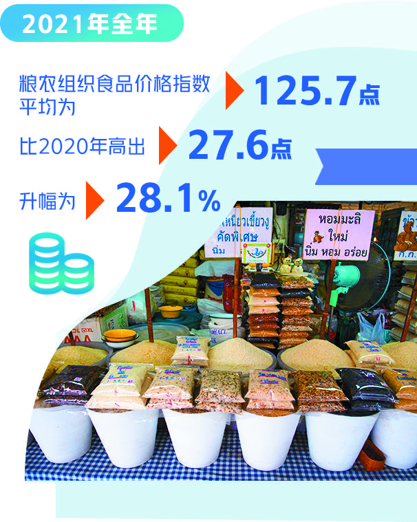 粮农组织谷物价格指数2021年12月平均为140.5点,比11月下降0.9点,降幅为0.6%。由于南半球谷物收获后供应改善及需求放缓,12月小麦出口价格下跌。由于需求强劲以及对巴西持续干旱存在担忧,玉米价格更加坚挺。受玉米市场影响,高粱价格有所上涨,但大麦报价略有下降。12月,随着需求疲软以及各主要供应国货币对美元贬值,国际稻米价格有所松动。2021年全年,粮农组织谷物价格指数平均为131.2点,比2020年上升28.0点,升幅为27.2%,达到自2012年以来的年度最高平均值。