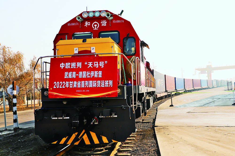 1月6日11时40分,满载着870吨货物的75027次中欧班列从中国铁路兰州局集团有限公司武威南站开出。这是甘肃省2022年开出的首趟“中欧班列”。班列与传统海运相比,运输时间可节约30天。本报记者 李琛奇摄