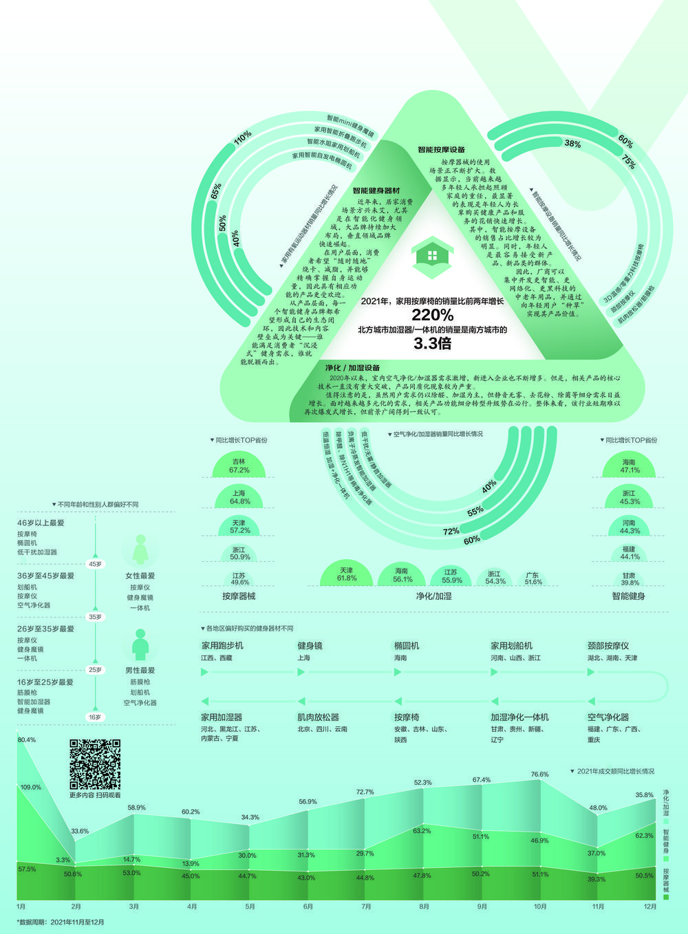 可以精确控制运动时间、运动部位、运动量和自我诊断的智能健身器材,适用于全家的按摩器械,精准控制指标的空气净化器……当前,“以消费者为中心”的智能健康产品和服务理念正在改变健康产业和市场,变革创新速度不断提升。