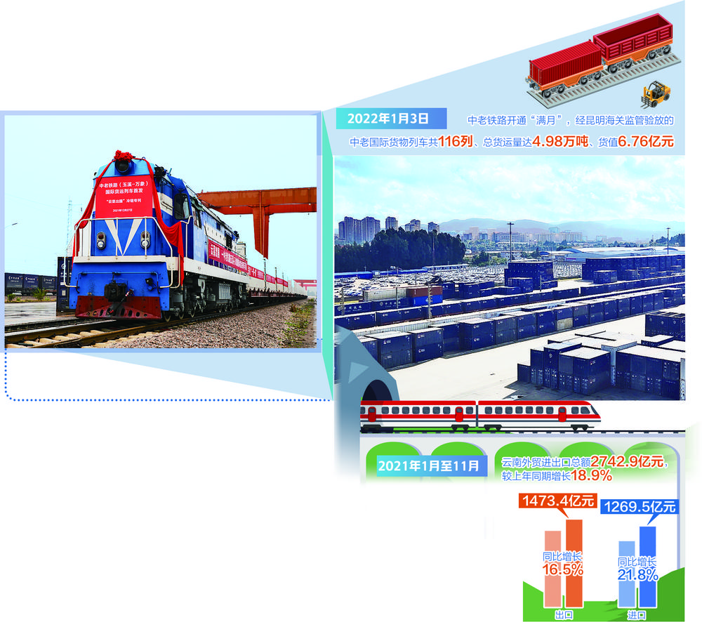 2022年1月3日,中老铁路开通运营“满月”,经昆明海关监管验放的中老国际货物列车共116列、总货运量达4.98万吨、货值6.76亿元。