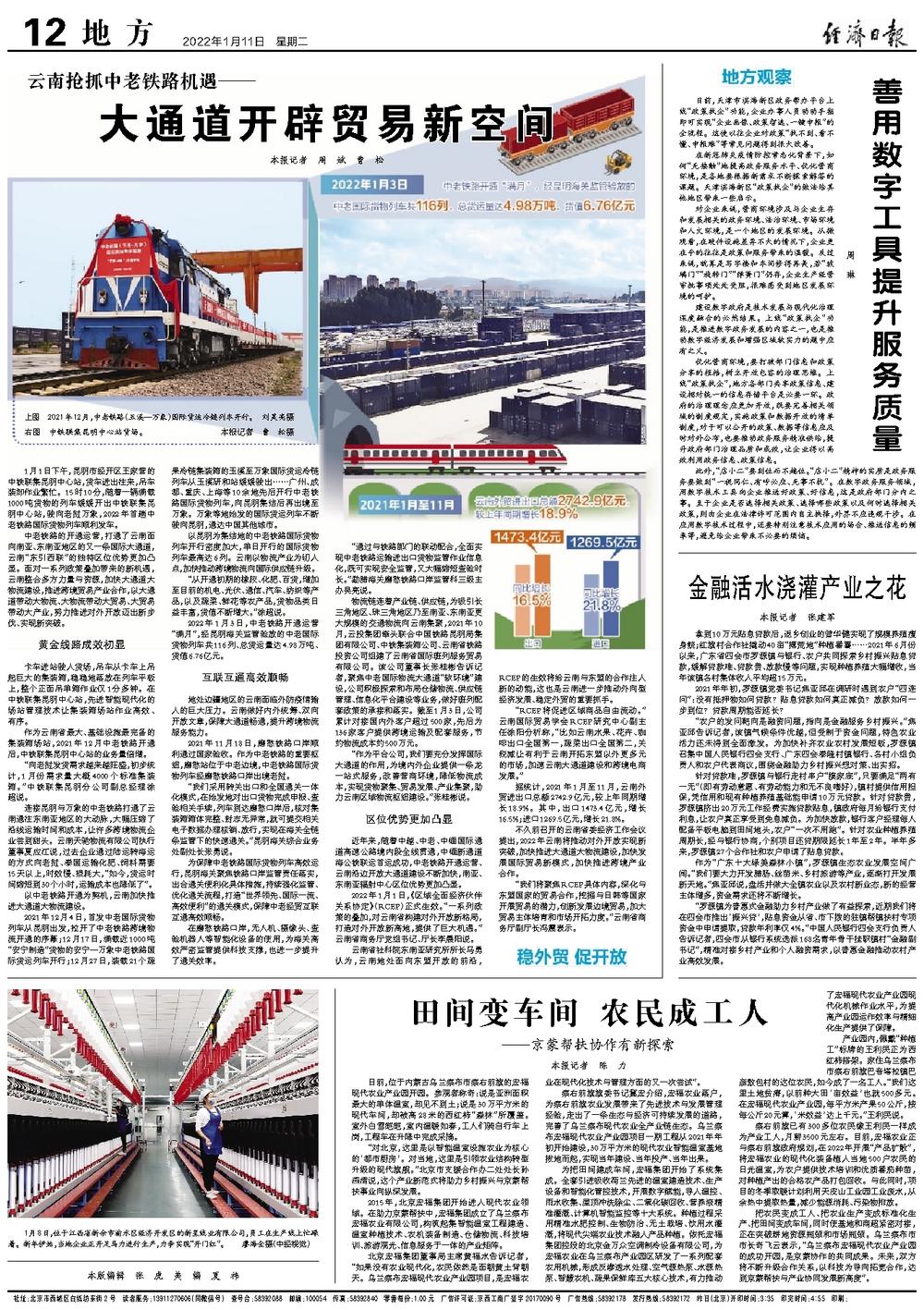 物流链连着产业链、供应链,为吸引长三角地区、珠三角地区乃至南亚、东南亚更大规模的交通物流向云南集聚,2021年10月,云投集团牵头联合中国铁路昆明局集团有限公司、中铁集装箱公司、云南省铁路投资公司组建了云南省国际班列服务贸易有限公司。该公司董事长张桂彬告诉记者,聚焦中老国际物流大通道“软环境”建设,公司积极探索和布局仓储物流、供应链管理、信息化平台建设等业务,做好班列配套政策的承接和落实。截至1月3日,公司累计对接国内外客户超过500家,先后为136家客户提供跨境运输及配套服务,节约物流成本约500万元。