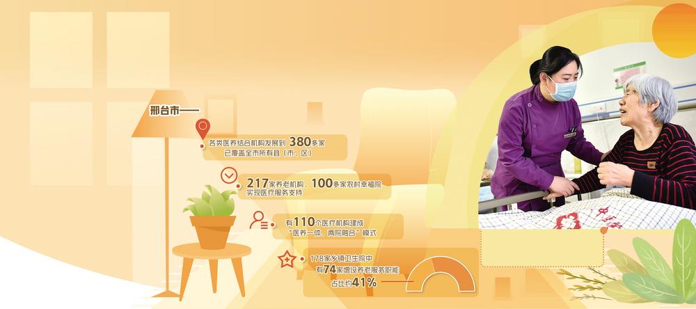 如今,邢台市31家二级以上综合医院中,有27家开设了老年医学科;178家乡镇卫生院中,有74家增设养老服务职能,占比约41%,大大减轻了农村“鳏寡孤独”等特殊群体的生活压力。
