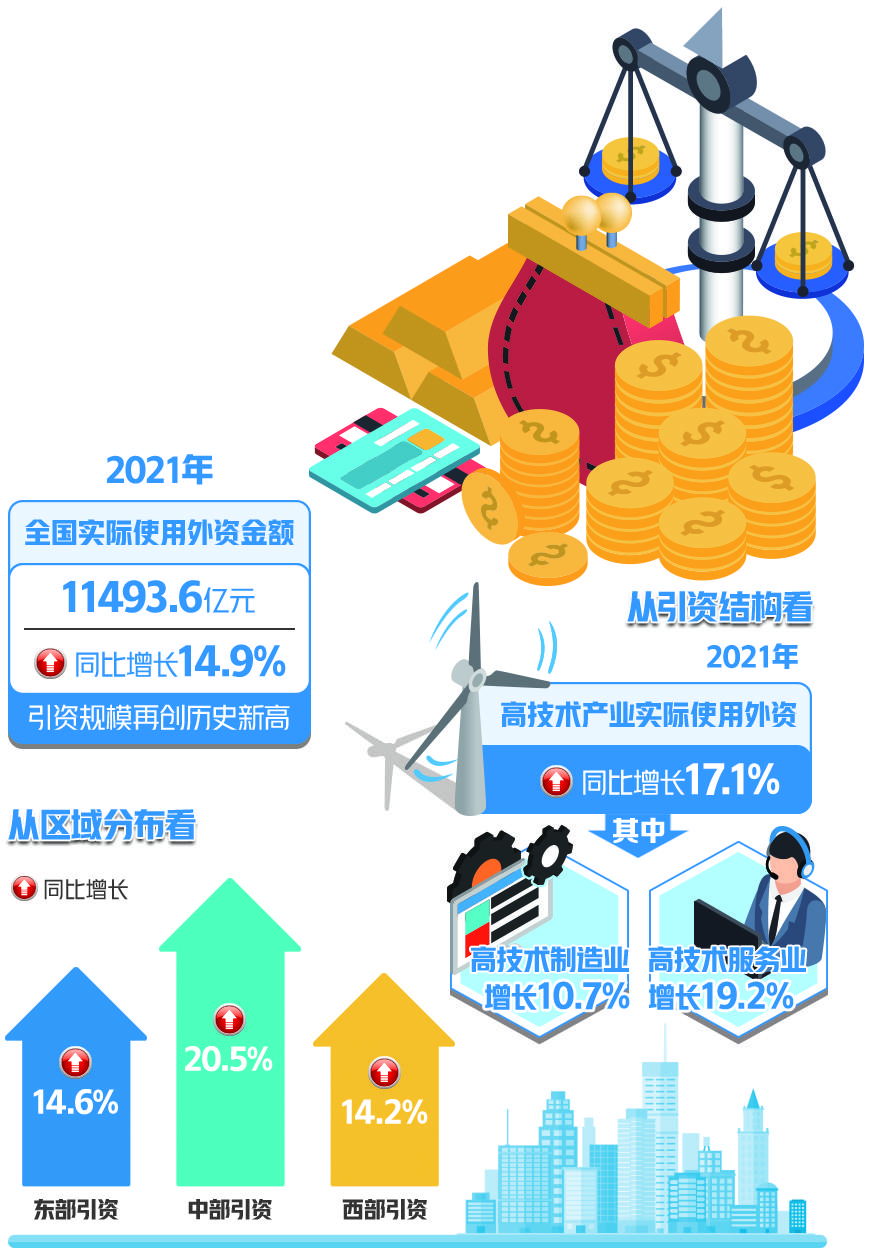 从区域分布看,我国东部、中部、西部地区实际使用外资同比分别增长14.6%、20.5%和14.2%。