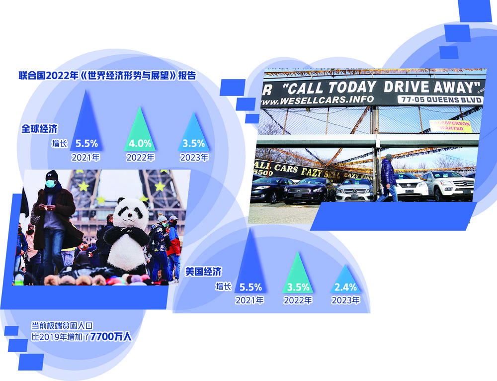 当地时间1月13日,联合国发布2022年《世界经济形势与展望》报告指出,由于奥密克戎变异毒株引发新一轮新冠肺炎疫情,劳动力市场挑战不断,供应链问题得不到解决,加上通胀压力增加,全球经济复苏正面临巨大阻力。继2021年经济增长5.5%后,2022年全球经济预计仅增长4.0%,2023年预计增长3.5%。