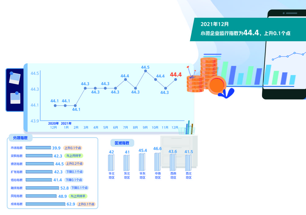 2021年12月,“经济日报—中国邮政储蓄银行小微企业运行指数”为44.4,较前月上升0.1个点。自2020年12月以来,小微企业持续复苏,近几个月虽然指数略有波动,但没有改变总体稳定运行态势。