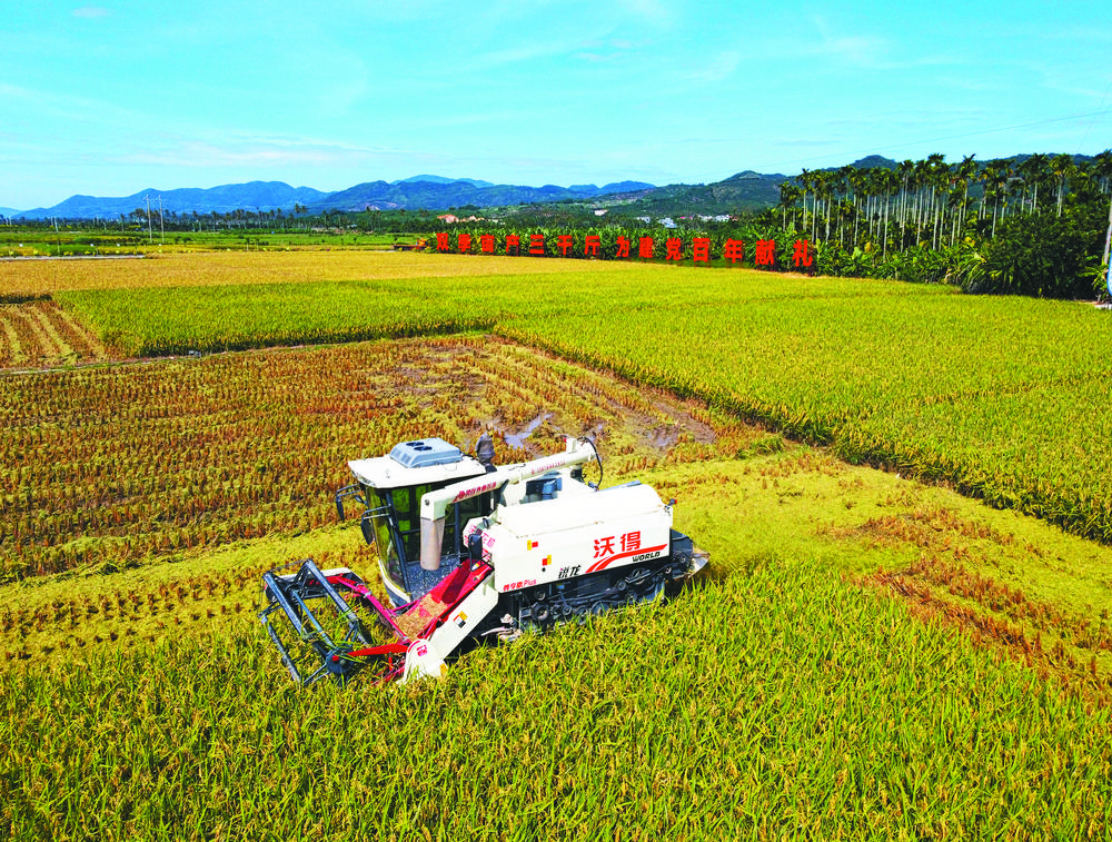 ▼三亚市崖州区城西村坝头南繁公共试验基地杂交水稻喜获丰收。由袁隆平团队研发的杂交水稻双季测产成功突破周年亩产1500公斤目标。李学仕摄(中经视觉)