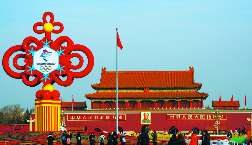 1月14日,矗立在北京天安门广场的“精彩冬奥”巨型中国结。随着春节和冬奥会临近,镶嵌着北京2022年冬奥会会徽及冰雪元素的巨型中国结亮相天安门广场,表达对北京冬奥会的美好祝福,该中国结是“精彩冬奥”主题花坛的主体部分。目前,北京已在10个点位布置冬奥主题花坛,预计1月20日全部完工。本报记者 赵 晶摄