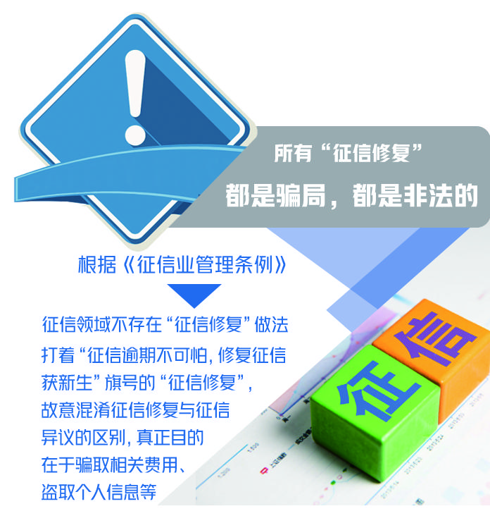 “毫无疑问,所有‘征信修复’都是骗局,都是非法的。”招联金融首席研究员董希淼表示,根据《征信业管理条例》,征信领域不存在“征信修复”做法。那些打着“征信逾期不可怕,修复征信获新生”旗号的“征信修复”,故意混淆征信修复与征信异议的区别,真正目的在于骗取相关费用、盗取个人信息等。