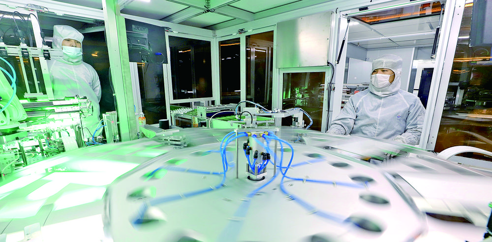 1月15日,位于江西南昌经开区智能光电产业园的江西联创致光科技有限公司生产车间内,工人们正在新组建的生产线上赶制订单产品。