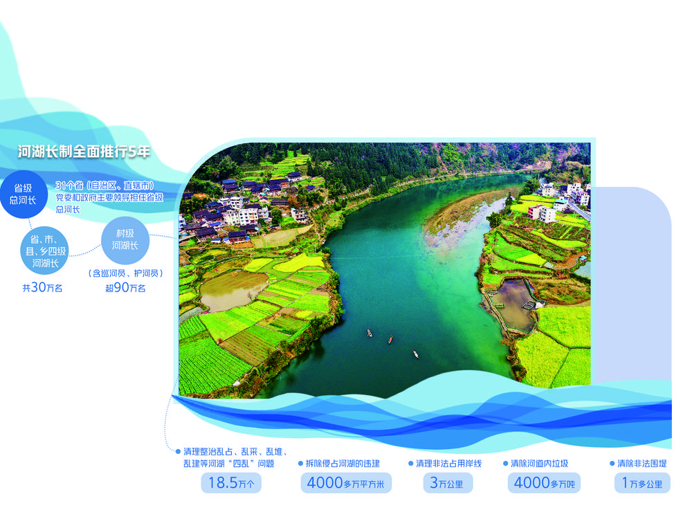 “一级抓一级,层层抓落实。”魏山忠介绍,5年来,31个省(自治区、直辖市)党委和政府主要领导担任省级总河长,省、市、县、乡四级河湖长共30万名,村级河湖长(含巡河员、护河员)超90万名,实现了河湖管护责任全覆盖。