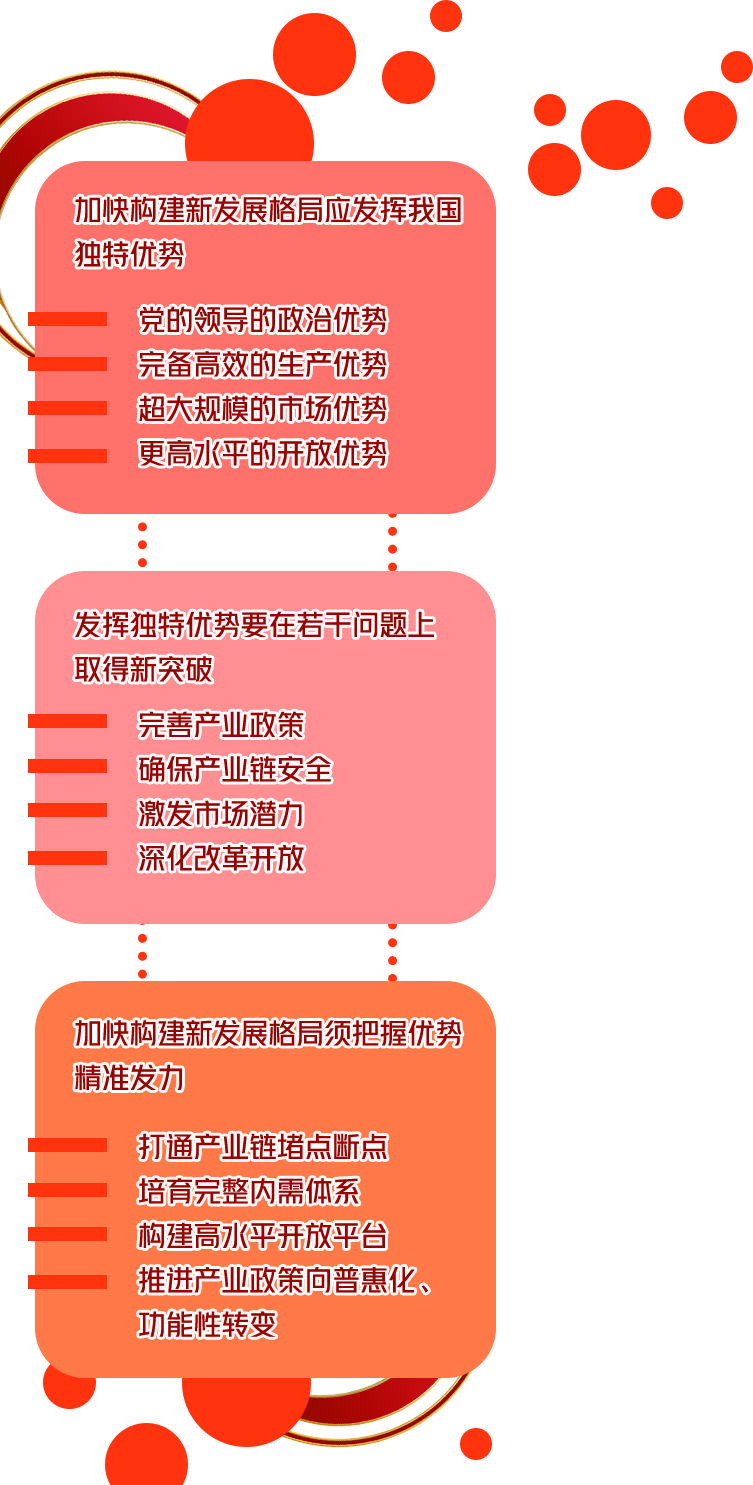 独特优势不会自动转换为加快构建新发展格局的动能,因此必须构建使优势作用得以充分发挥的机制,在产业政策引导、产业链安全可控、激发市场潜力、深化改革开放等问题上不断取得新突破。