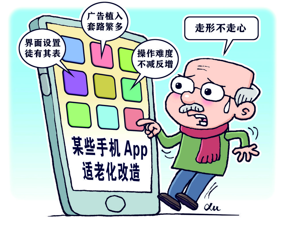 随着我国社会老龄化的加深,不少企业将目光投向老年群体,对手机App进行适老化改造,让字体、页面布局等能适应老年群体的使用习惯。然而,部分手机App适老化改造并不理想,存在广告植入套路多、界面设置徒有其表、操作难度不减反增等问题,备受用户诟病。对此,除了有关部门加强引导和指导外,相关企业也应加强调研,对老年人使用手机App的偏好、痛点等需求增进了解,避免适老化改造流于形式,努力消减老年人的“数字鸿沟”,让老年人共享乐享互联网红利。(时 锋)