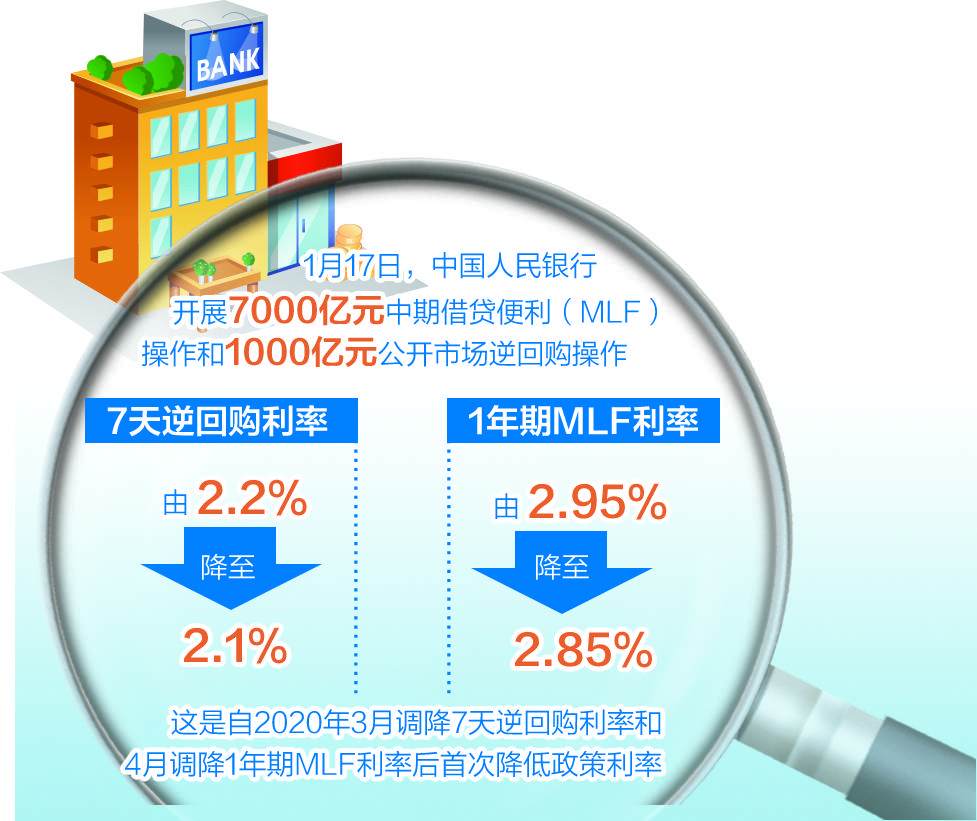 1月17日,中国人民银行开展7000亿元中期借贷便利(MLF)操作和1000亿元公开市场逆回购操作。MLF和公开市场逆回购操作的中标利率均下降10个基点。调降后,7天逆回购利率由2.2%降至2.1%,1年期MLF利率由2.95%降至2.85%。这是自2020年3月调降7天逆回购利率和4月调降1年期MLF利率后首次降低政策利率。