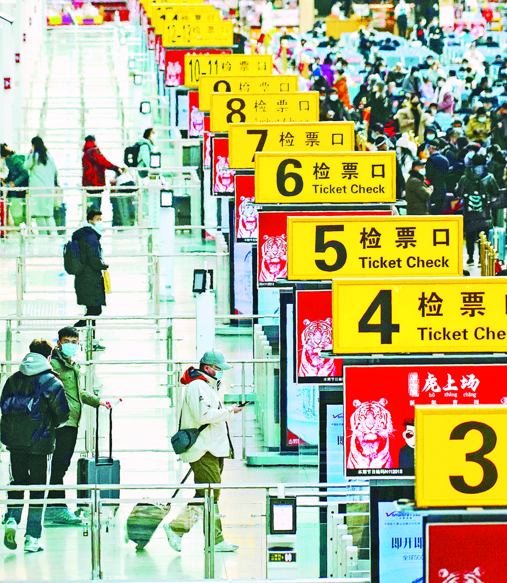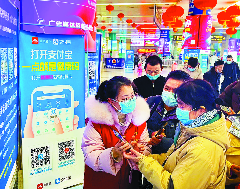 1月17日,在南昌火车站,南昌市西湖区志愿者帮助旅客做好进站扫码,提高车站运转效率。曾 艳摄(中经视觉)