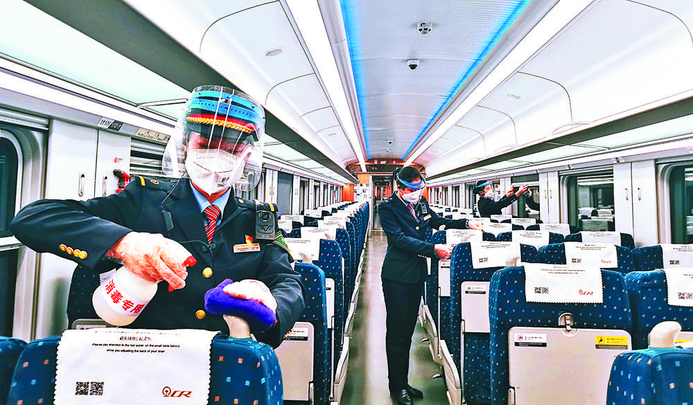 1月17日,北京西站开往江西南昌的D737次列车长闵莉(左一)和乘务员认真做好列车预防性消毒,让旅客出行安心、放心。许 慧摄(中经视觉)