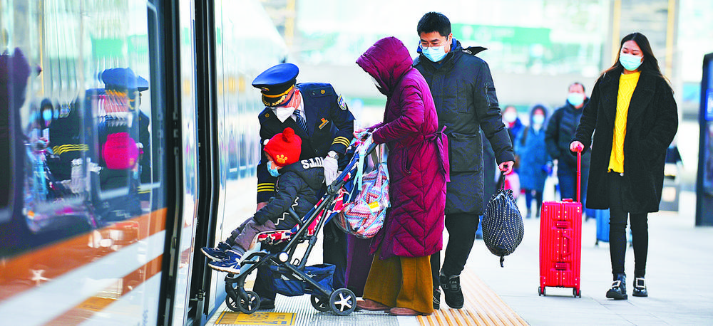 1月17日,由中国铁路呼和浩特局集团有限公司包头客运段承担的北京北开往包头的G2491次列车,安全员在站台引导旅客有序乘车。杜 鑫摄(中经视觉)