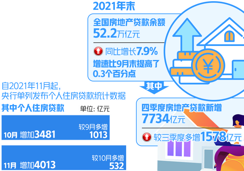 房地产贷款“稳刚需”的政策效果正在逐步显现。中国人民银行最新数据显示,截至2021年12月末,全国房地产贷款余额52.2万亿元,同比增长7.9%,增速比9月末提高了0.3个百分点。来自中国银保监会的最新数据显示,购房者的合理住房需求进一步得到满足,个人住房贷款中90%以上用于支持首套房。