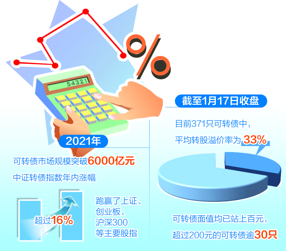 个券转股溢价率也在不断攀升。同花顺iFinD数据显示,截至1月17日收盘,目前371只可转债中,平均转股溢价率为33%;同时,可转债面值均已站上百元,超过200元的可转债逾30只。专家表示,当前市场流动性较为充沛,机构转债配置需求旺盛,支撑可转债市场景气度。同时,在资管新规背景下,银行理财加速净值化转型,部分理财资金进入转债市场,进一步推升个股溢价率。