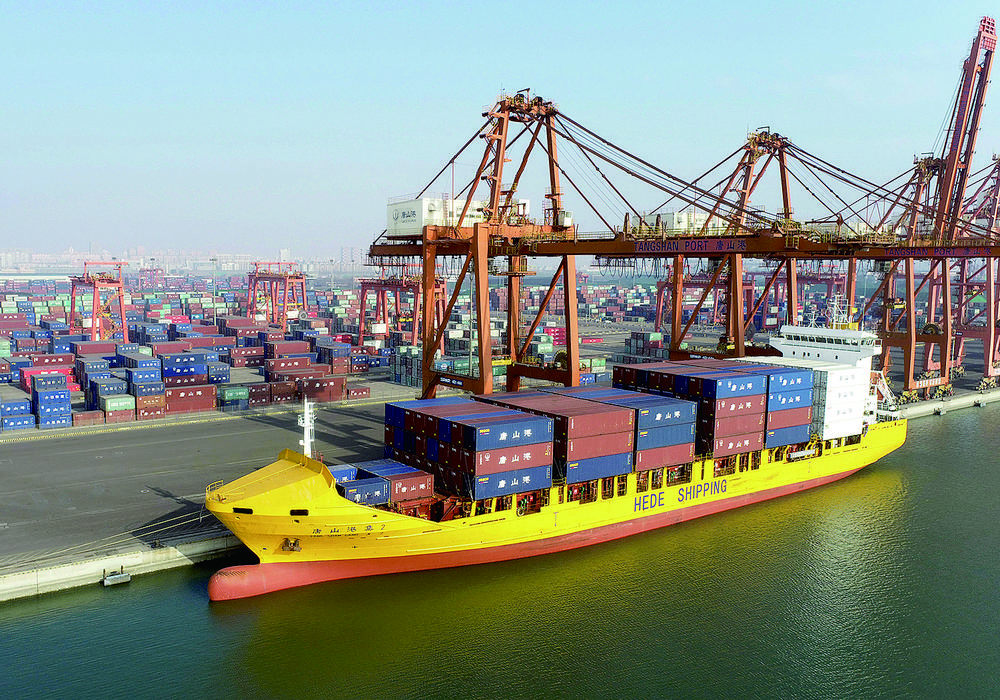 1月16日,一艘轮船靠泊在唐山港京唐港区集装箱码头装货(无人机照片)。据悉,2021年唐山港货物吞吐量达72240万吨,同比增长2.81%。 新华社记者 杨世尧摄