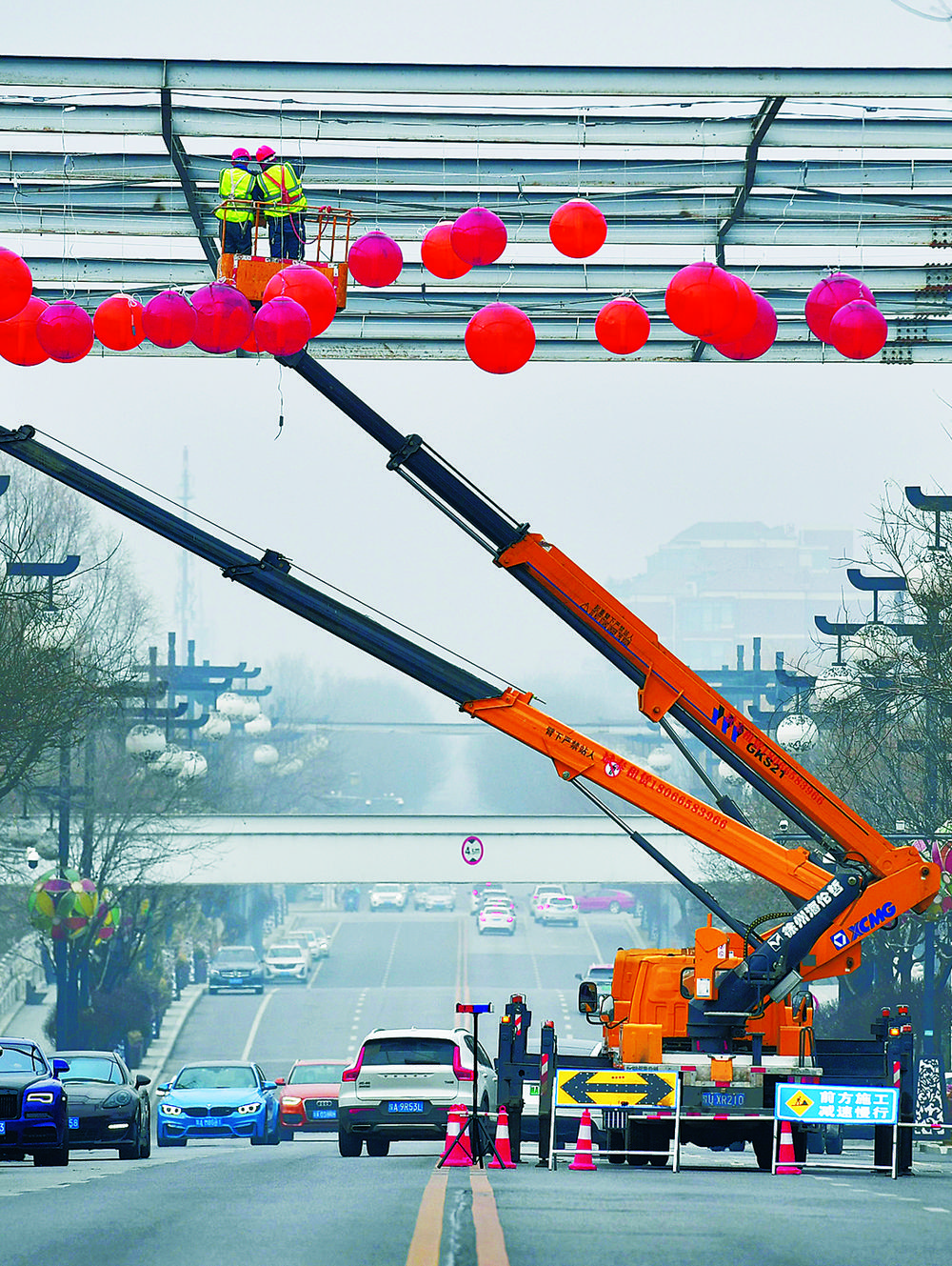 1月20日,在西安市曲江池北路上,工人在安装彩灯。自1月19日起,西安市曲江新区、未央区、经开区、浐灞生态区、国际港务区陆续迎来解封。上述区域在落实常态化疫情防控措施的基础上,恢复正常生产生活秩序。新华社记者 邵 瑞摄