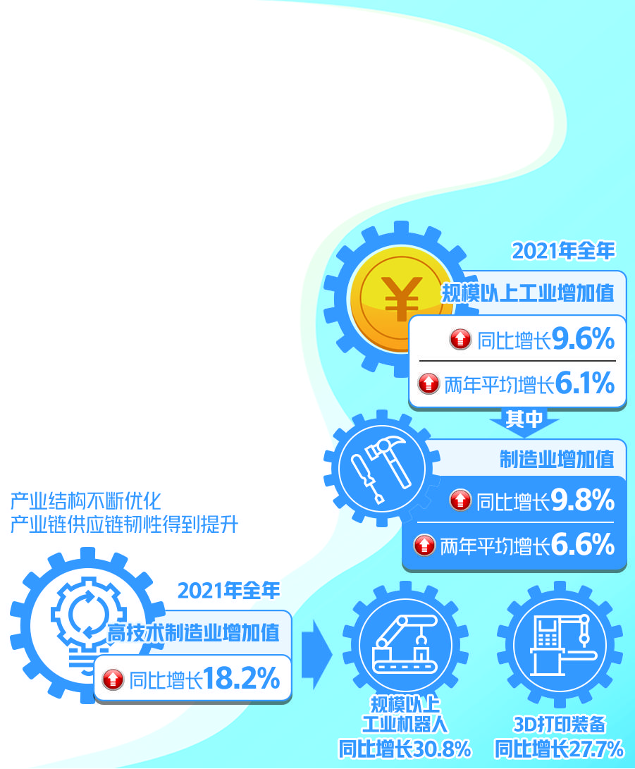 受一些因素叠加影响,2021年三季度工业经济增速呈回落态势,但随着助企纾困、能源保供稳价等政策措施效果显现,四季度增幅回升。全年制造业增加值同比增长9.8%;工业产能利用率达77.5%,比上年提高3个百分点;规模以上工业出口交货值同比增长17.7%。