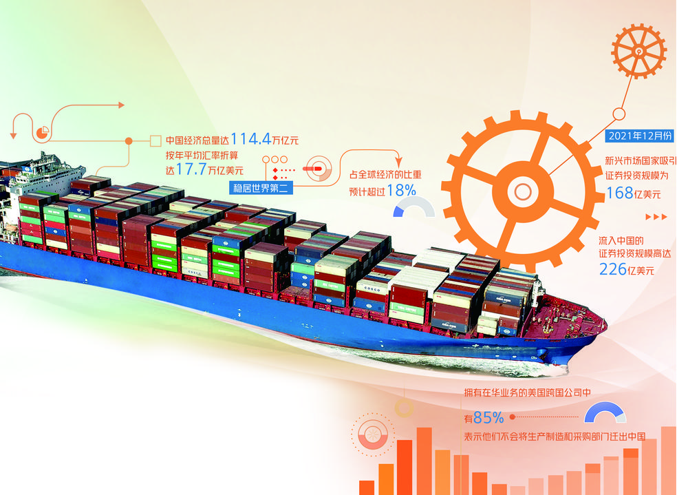在证券投资方面,国际金融协会日前发布的数据显示,2021年12月份,新兴市场国家吸引证券投资规模为168亿美元,而流入中国的证券投资规模高达226亿美元,其他新兴市场国家整体为净流出。国际金融协会分析认为,这反映出越来越多的国际投资者认为中国经济发展具有更高的稳定性和可持续性。
