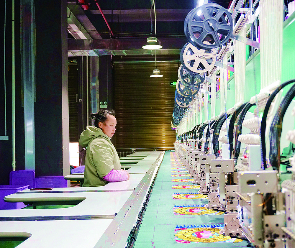 1月18日,在贵州省黔东南苗族侗族自治州美娥社区企业车间,经过培训上岗的工人正在涤纶缝纫生产线上忙碌。近年来,当地依托龙头企业建立“党建+惠农车间”,吸纳农村劳动力进企业上班,实现在家门口就业增收。石宏辉摄(中经视觉)