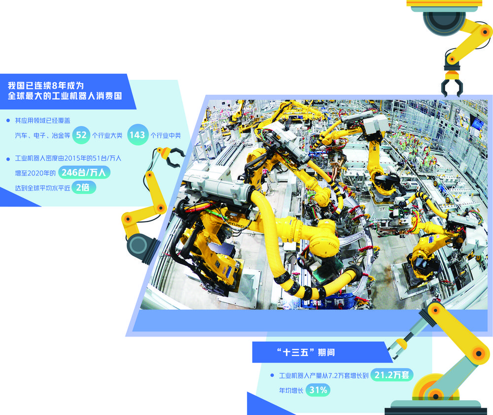 “十三五”期间,通过持续创新、深化应用,我国机器人产业呈现良好发展势头。其中,工业机器人产量从7.2万套增长到21.2万套,年均增长31%。“快速增长得益于政策、生产能力的支撑以及应用场景保障。此外,新冠肺炎疫情仍在全球蔓延,中国依托完整的产业链和有力的疫情防控措施,承接其他国家转移至中国的制造业订单。”在国家信息中心预测部产业经济研究室主任魏琪嘉看来,外贸订单增加使得依靠传统低成本要素扩大产能的发展模式受到严峻挑战,制造业企业亟需通过工业机器人提高产能,其需求被进一步激发。