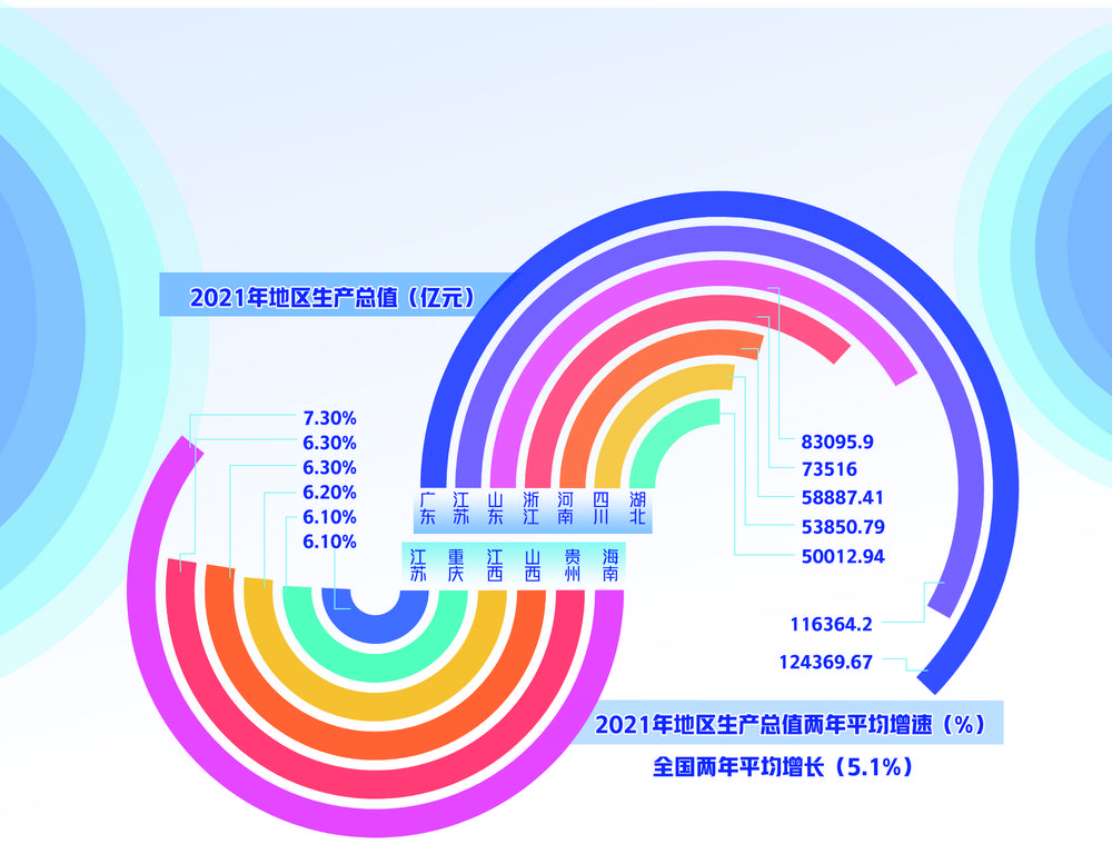 2021年地方经济年报已陆续发布。结合各地统计局数据及政府工作报告内容看,多个省份经济总量再上新台阶,主要指标好于预期,实现“十四五”良好开局。其中,广东以超12万亿元的经济总量稳居第一,湖北以12.9%的同比增速居首,海南则以7.3%的两年平均增速领跑全国。盘点各地成绩单,“首次突破”“再创新高”“高质量发展”等成为关键词,经济发展动力强、韧性足的特征持续显现。