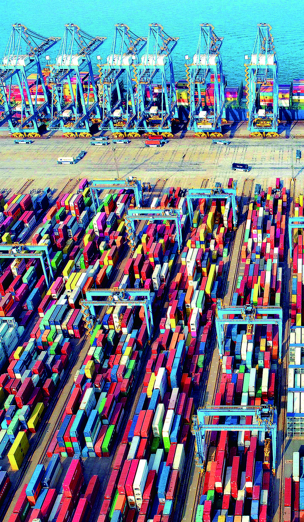 近日,在山东港口青岛港全自动化码头,集装箱堆场一派繁忙。青岛港2021年完成货物吞吐量6.3亿吨,同比增长4.3%;完成集装箱吞吐量2371万标箱,同比增长7.8%。张进刚摄(中经视觉)