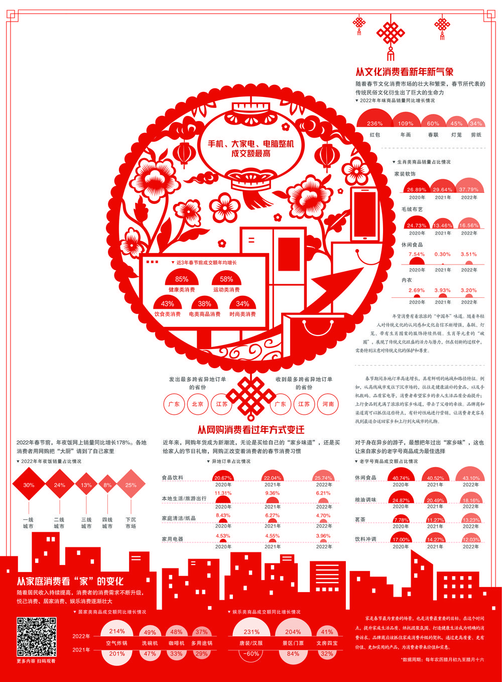截至1月23日17时,传统小年前两天,消费者已线上下单逾6.02亿件年货。这意味着,“年货春运”持续火爆,在全国范围内形成了“人未出行,货已到家”的消费新现象。这背后,是传统文化引领的红火氛围,是涌动的消费热情,更是中国年温暖的亲情流动。