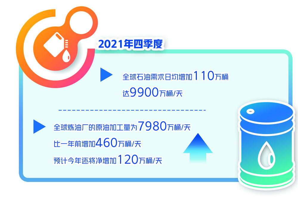 国际能源署的最新石油市场报告为市场普遍的乐观情绪提供了佐证。该机构改变了以往较为悲观的预期,认为今年石油需求将有较大回升。据统计,去年四季度全球石油需求日均增加110万桶,达9900万桶/天。在炼油方面,全球炼油行业去年表现出色,企业产能和利润均有回升。去年四季度全球炼油厂的原油加工量为7980万桶/天,比一年前增加460万桶/天,预计今年还将净增加120万桶/天。在库存方面,经济合作与发展组织(OECD)工业原油库存去年12月份减少了4500万桶,总库存量为27.56亿桶,比一年前减少了3.54亿桶,是7年来的最低水平。