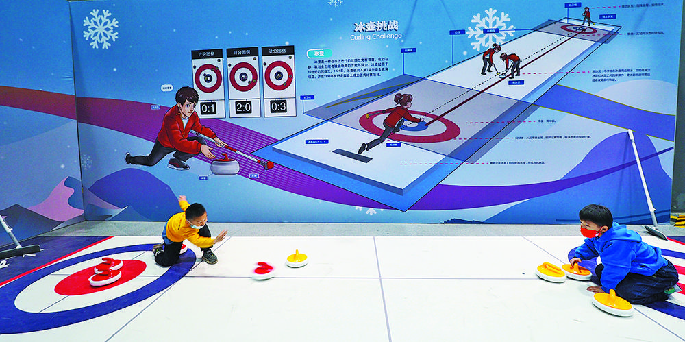 1月28日,小朋友在中国科技馆“冬梦飞扬”科技冬奥主题展览上体验冰壶运动。展览26日向公众开放,结合5G、4K、VR等现代技术手段,为观众营造一个可参与、可互动、可体验的冬奥冰雪世界。杜建坡摄(中经视觉)