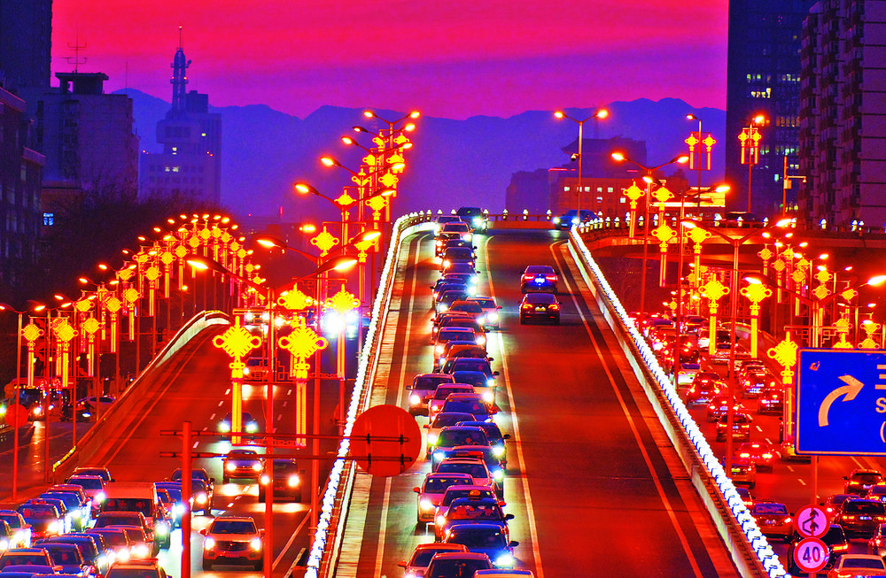 1月28日,北京长安街两侧悬挂着中国结和大红灯笼,复兴门外大街木樨地立交桥流光溢彩,静候即将到来的新春佳节和2022年北京冬奥会。郭俊锋摄(中经视觉)