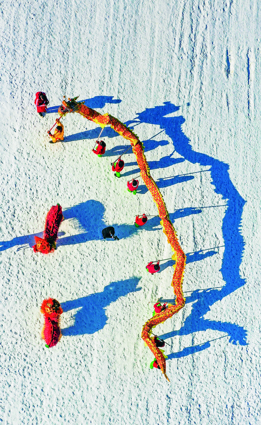 1月29日,河北遵化市建明镇穆家庄村艺人到当地滑雪场进行舞龙等民俗表演,喜迎北京冬奥和新春。刘满仓摄(中经视觉)