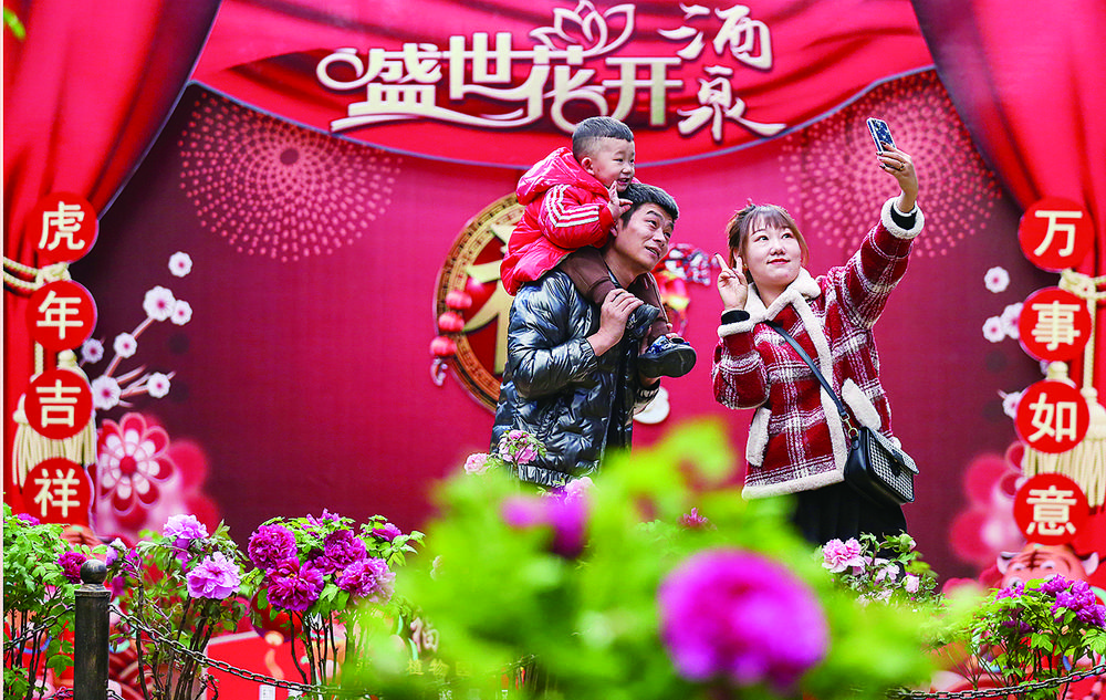 2月1日,甘肃酒泉市肃州区观光生态植物园,游客留影打卡。春节假日,该植物园举办迎冬奥贺新春牡丹文化节,吸引众多游客观赏。 侯崇慧摄(中经视觉)